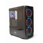 El chasis Spidertec Gaming 8010 es una torre ATX orientada al alto rendimiento y la estética gamer. Su diseño destaca por un panel lateral de vidrio templado y un sistema de refrigeración activo compuesto por tres ventiladores LED RGB frontales que optimizan el flujo de aire. Fabricado en acero robusto, el gabinete incluye una fuente de poder de 600W y un panel frontal con conectividad USB 3.2 y USB 2.0, ofreciendo una solución completa y visualmente atractiva para configuraciones de gama media.